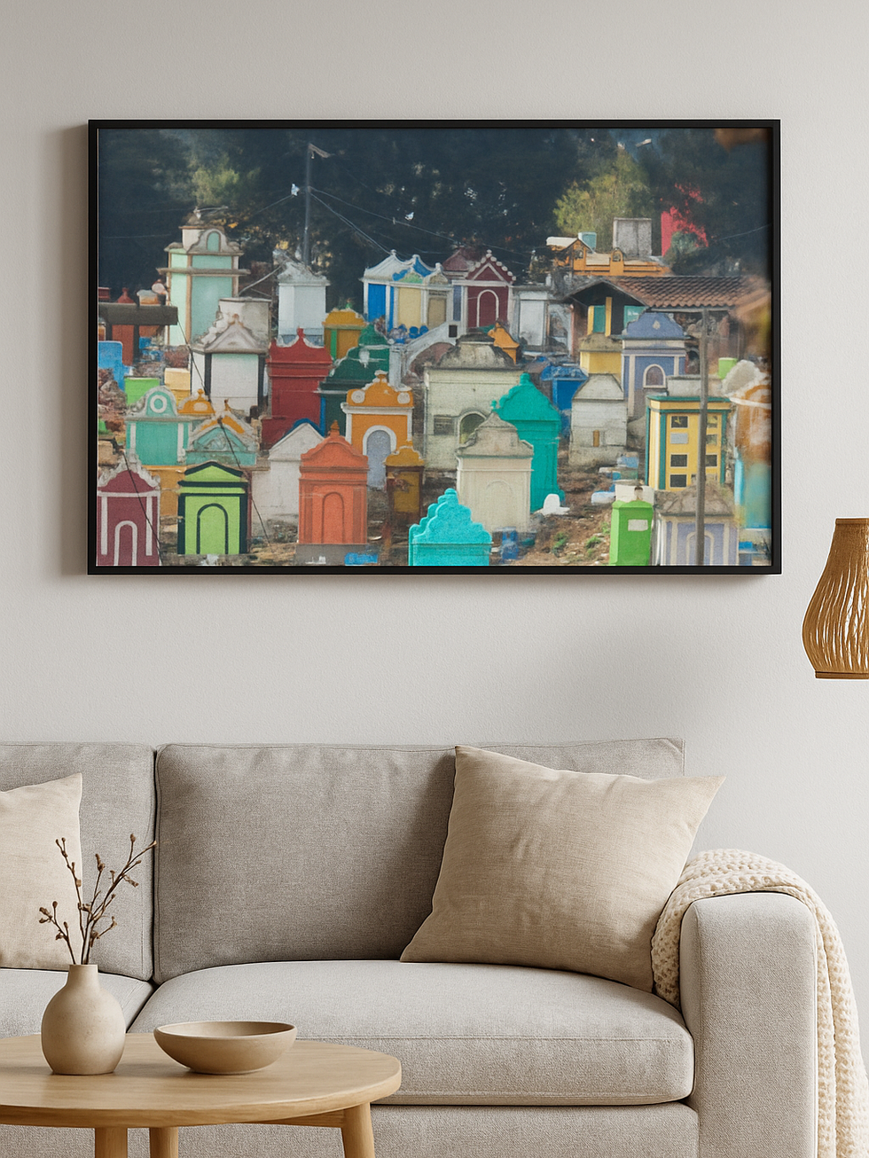 Uma colina coberta de túmulos coloridos forma uma paisagem insólita e vibrante. Tons de verde azul amarelo e vermelho transformam o cemitério em uma celebração da vida revelando como algumas culturas veem a morte com esperança e alegria.