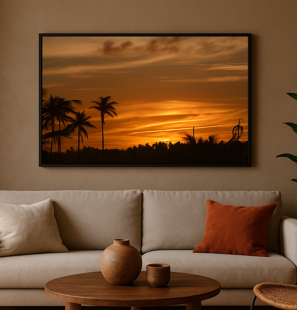 O céu em combustão e o perfil das palmeiras criam um hino visual ao entardecer tropical. Uma fotografia que respira calor e melancolia.