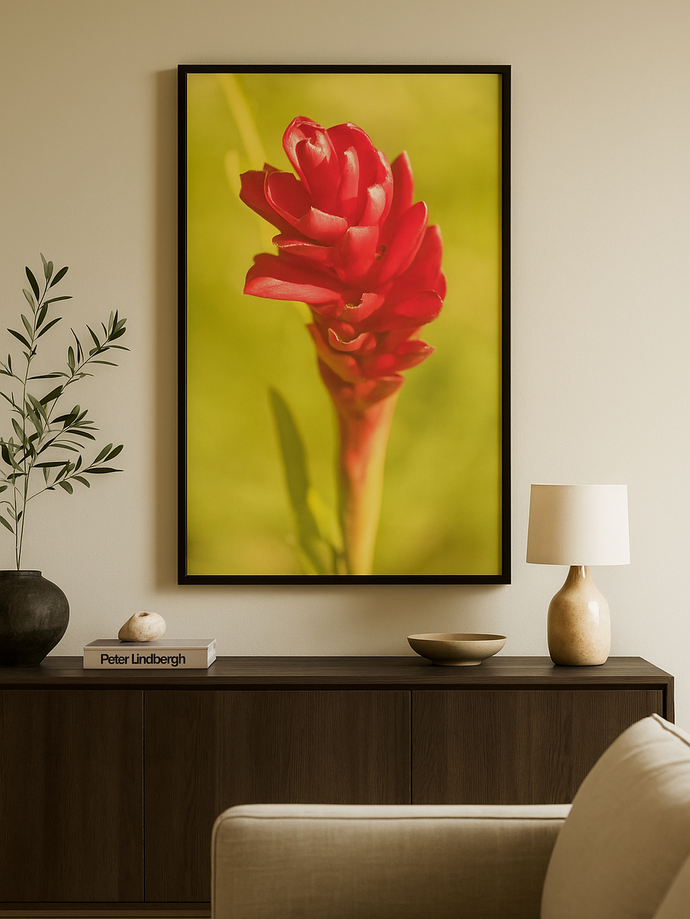 Uma flor vermelha em plena luz natural ergue-se contra um fundo esverdeado desfocado. Suas pétalas parecem chamas que se abrem suavemente irradiando calor e vitalidade em contraste com a serenidade do entorno.
