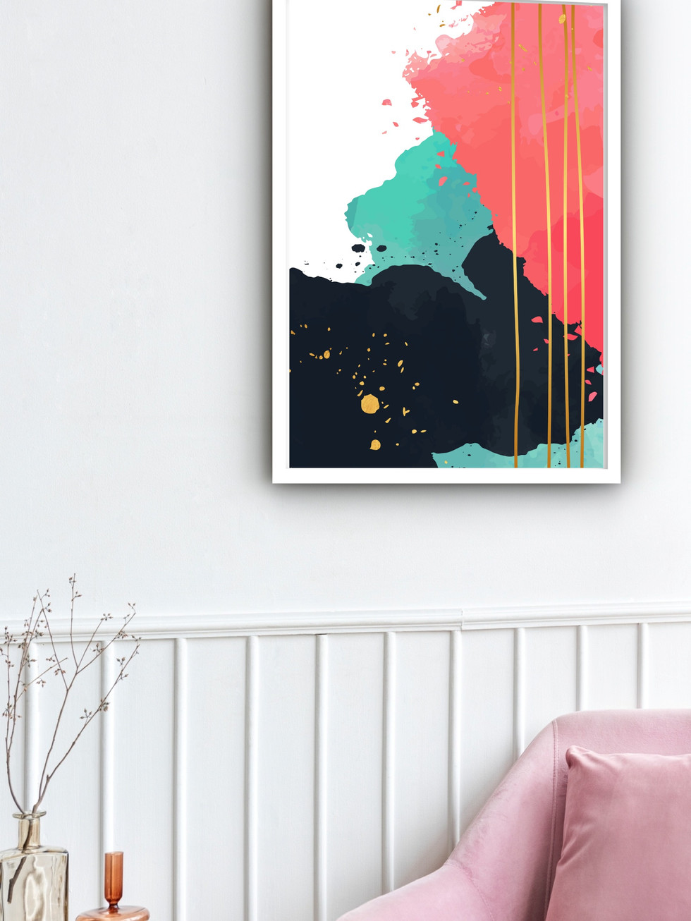 A composição deste quadro abstrato é dinâmica e cheia de personalidade. A técnica de aquarela, com suas manchas em coral, azul-petróleo e marinho, oferece um belo contraste de cores frias e quentes. As linhas verticais douradas e os respingos metálicos adicionam uma camada de sofisticação, transformando a peça em um ponto focal elegante. É ideal para interiores que buscam um toque moderno e luxuoso na decoração.
