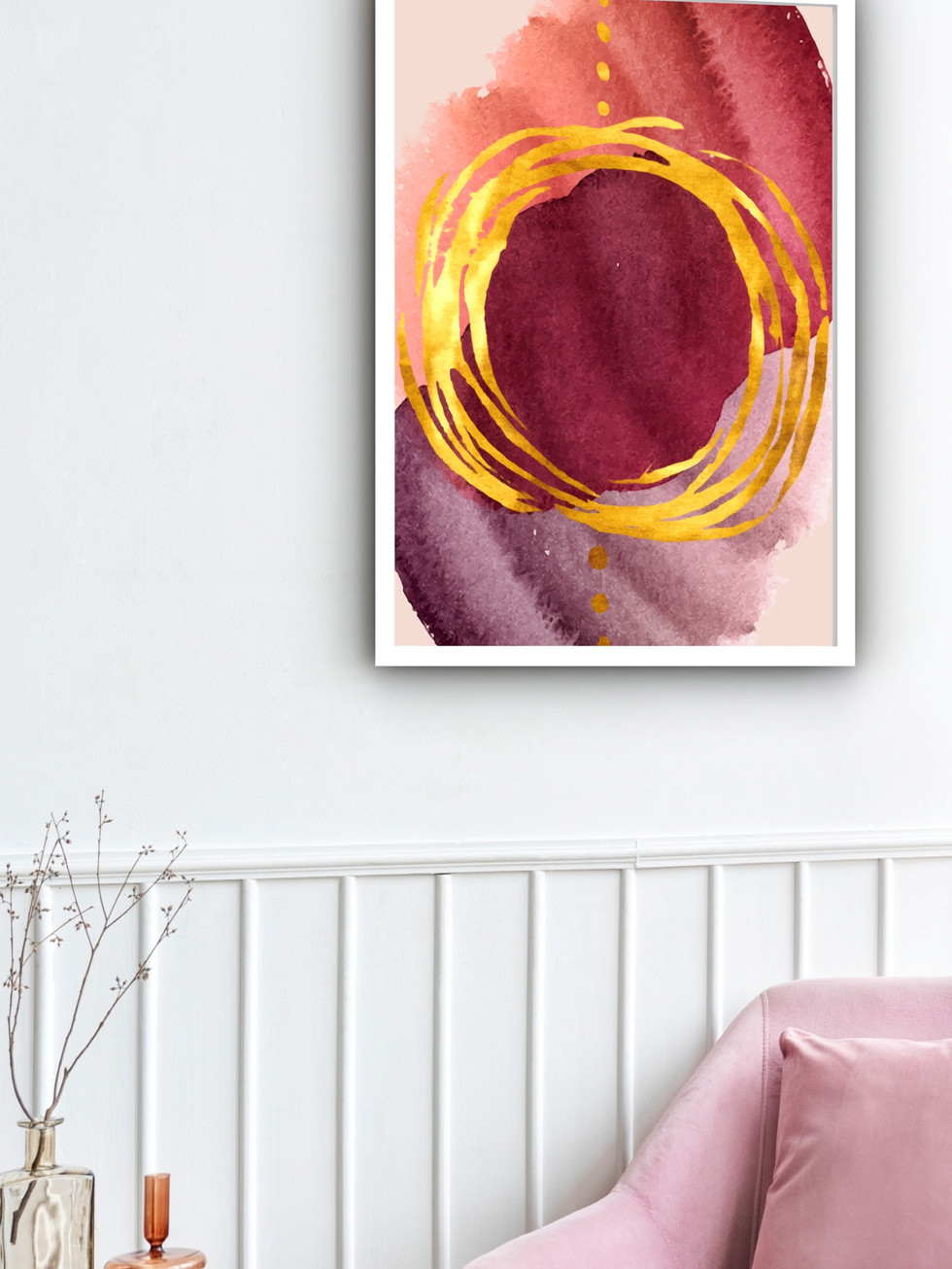 Este quadro abstrato exibe uma fusão rica e dramática de cores. Os tons de vinho tinto e roxo, aplicados com um efeito de aquarela fluido, criam uma base escura e texturizada. O destaque é o anel dourado irregular, cuja aplicação brilhante e gestual confere dinamismo e um toque de opulência. A peça é perfeitamente adequada para ambientes modernos que buscam elegância e um forte ponto focal, realçando o contraste entre a profundidade das cores escuras e o luxo do metalizado. É uma escolha sofisticada para decoração contemporânea.