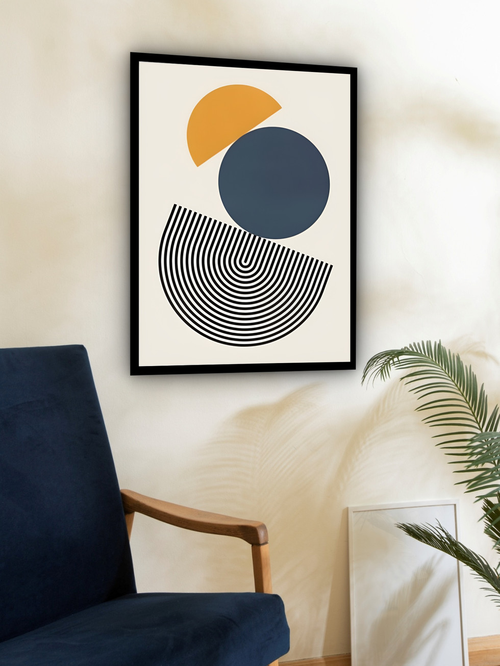 Este quadro decorativo exibe um estilo minimalista e contemporâneo, utilizando a geometria como foco principal. A composição é dominada por formas circulares e arcos em preto vibrante, combinando com blocos de cor em azul marinho e mostarda. O contraste é elegante e equilibrado. As linhas em espiral criam um movimento sutil, adicionando profundidade e interesse visual. É uma peça sofisticada, ideal para quem busca um toque moderno de arte abstrata, valorizando a estética clean e o design escandinavo na decoração.