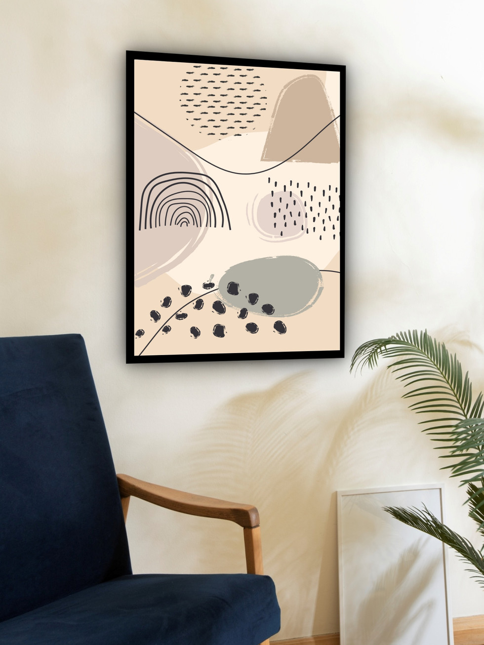 Este quadro abstrato utiliza uma paleta de cores neutras extremamente sofisticada e contemporânea. As pinceladas e as linhas orgânicas, incluindo o sutil formato de arco-íris, adicionam movimento e interesse visual à composição. A combinação de tons terrosos e detalhes em preto confere uma atmosfera minimalista e acolhedora. É ideal para quem busca elevar a decoração de ambientes modernos, como salas ou quartos, com um toque de arte elegante.