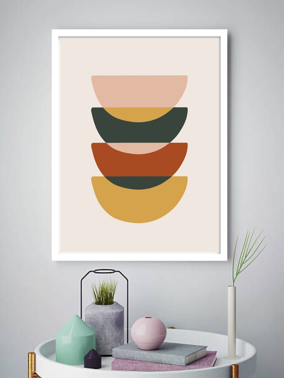 Este quadro abstrato utiliza a pureza das formas geométricas e uma paleta de cores terrosas e sofisticadas. A sobreposição harmoniosa das metades de círculos cria um ritmo visual suave e equilibrado. Os tons de rosa antigo, verde escuro e mostarda, em contraste com o fundo neutro, adicionam profundidade e calor. É uma peça minimalista, ideal para injetar uma atmosfera moderna e acolhedora em salas de estar ou escritórios contemporâneos. Um design atemporal e elegante que eleva instantaneamente o ambiente.