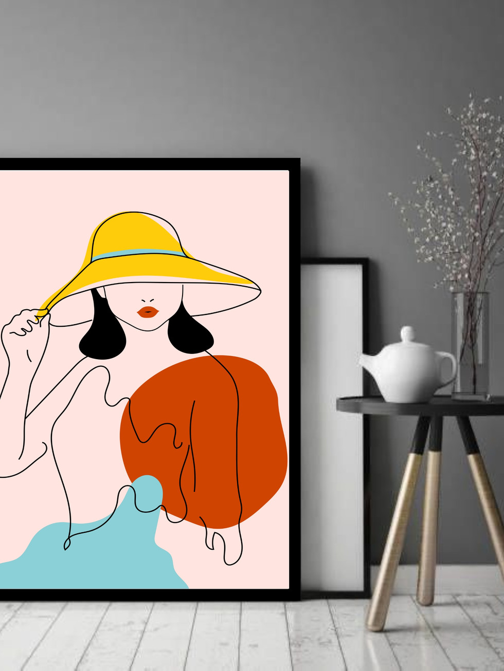 Este quadro une a elegância da arte de linha minimalista com a vivacidade das formas abstratas. A representação da mulher de chapéu amarelo evoca imediatamente a sensação de sol e férias de verão. O uso estratégico de blocos de cores sólidas, como o terracota e o azul-claro, confere modernidade e impacto visual à peça. É uma obra sofisticada que equilibra simplicidade e ousadia cromática. Ideal para ambientes que buscam um toque chic e contemporâneo, este estilo decorativo está muito em alta. A paleta suave do fundo complementa perfeitamente os tons fortes.
