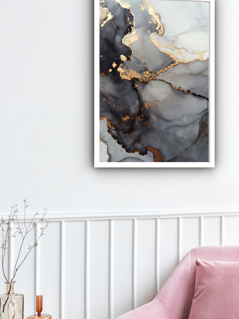 Este quadro abstrato captura a essência luxuosa do mármore, utilizando uma paleta dramática de cinzas profundos e leves. O destaque fica por conta das veias douradas, que injetam sofisticação e calor à composição. A técnica de fluidez cria uma textura visual rica e orgânica, conferindo profundidade à obra. É uma peça decorativa extremamente versátil, que harmoniza perfeitamente com ambientes modernos ou clássicos. A combinação dos tons de cinza com a poltrona rosa cria um contraste elegante e contemporâneo, elevando o design do espaço.