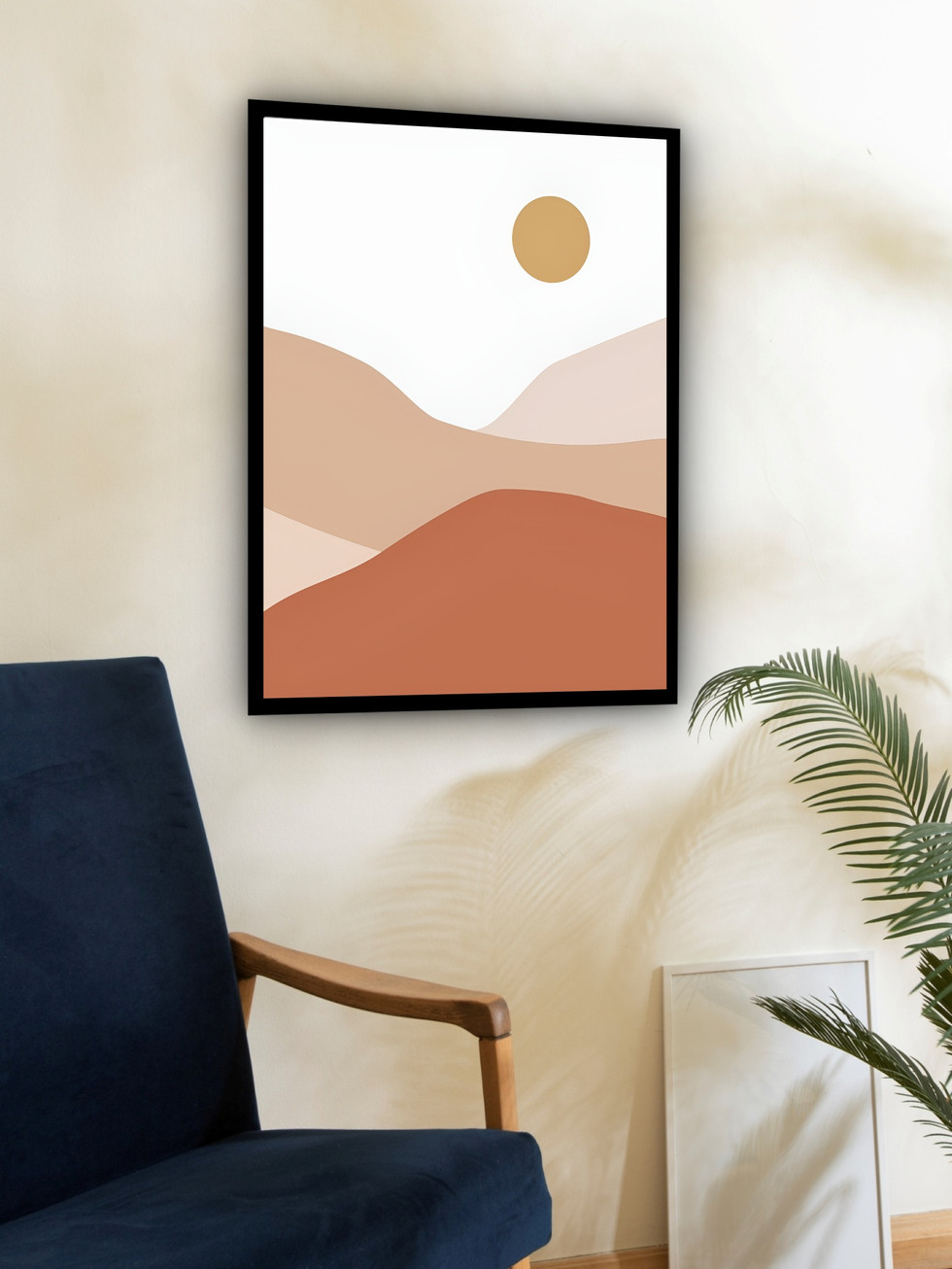 Este quadro decorativo é a definição do minimalismo elegante. A composição utiliza formas orgânicas e geométricas simples para sugerir uma paisagem desértica. A paleta de cores é extremamente harmoniosa, dominada por tons terrosos quentes como o terracota e o bege pálido, contrastando com o sol dourado. A simplicidade intencional das linhas e a ausência de detalhes criam uma atmosfera calma e contemporânea. É uma peça sofisticada, ideal para quem busca integrar a tendência escandinava ou boho chic na decoração de interiores.