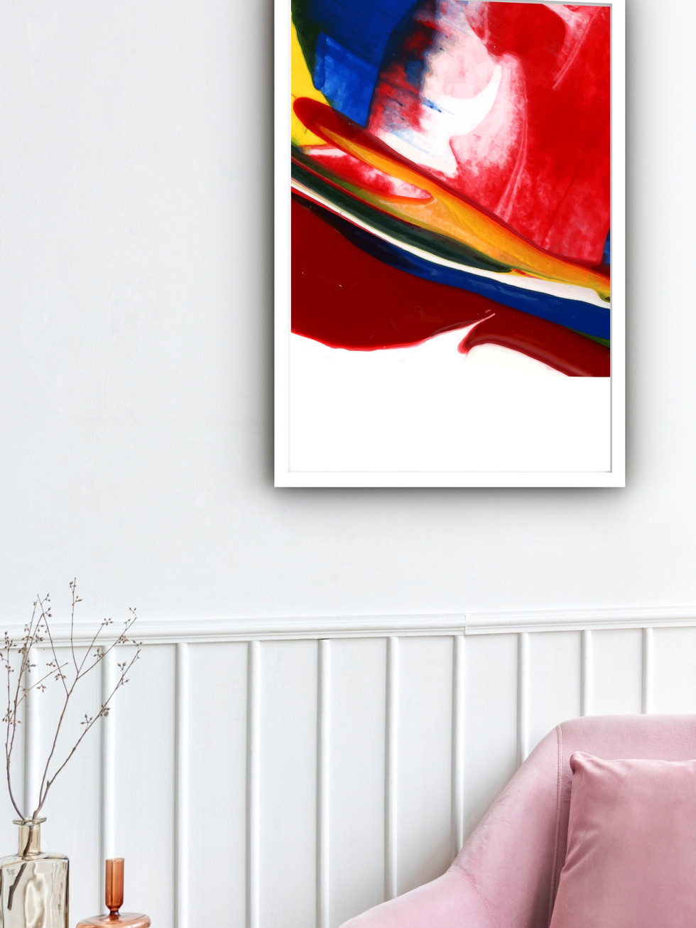 Este quadro abstrato é incrivelmente vibrante e dinâmico, utilizando o contraste poderoso entre o vermelho intenso, o azul profundo e os flashes de amarelo dourado. A maneira como a tinta flui sugere uma energia pura e um movimento constante na tela. É uma peça moderna ideal para adicionar um ponto focal arrojado. A moldura preta minimalista realça a explosão de cores, complementando perfeitamente a decoração contemporânea e sóbria do ambiente. Uma escolha audaciosa de arte para quem busca impacto visual imediato.