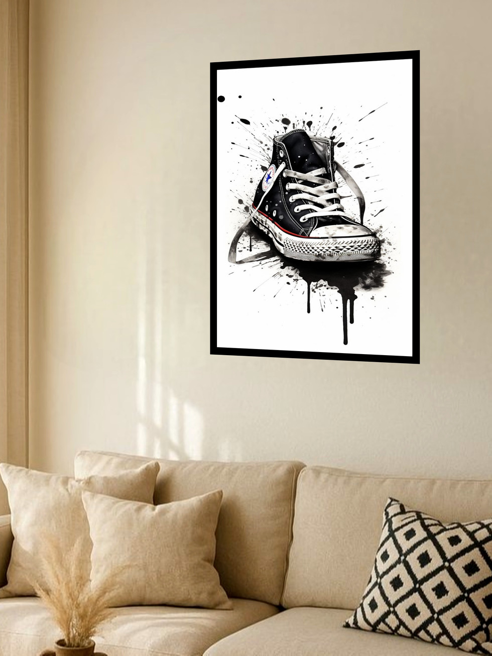 Este quadro captura a essência do estilo street com uma representação marcante do tênis de cano alto. A técnica de aquarela, utilizando tinta preta salpicada contra o fundo branco, confere um dinamismo impressionante à imagem. O contraste monocromático e a pequena sugestão de cor na lateral destacam o objeto como um ícone cultural. É uma peça perfeita para adicionar um toque de personalidade ousada a ambientes contemporâneos, como salas modernas ou estúdios, celebrando a moda casual e a arte gráfica.