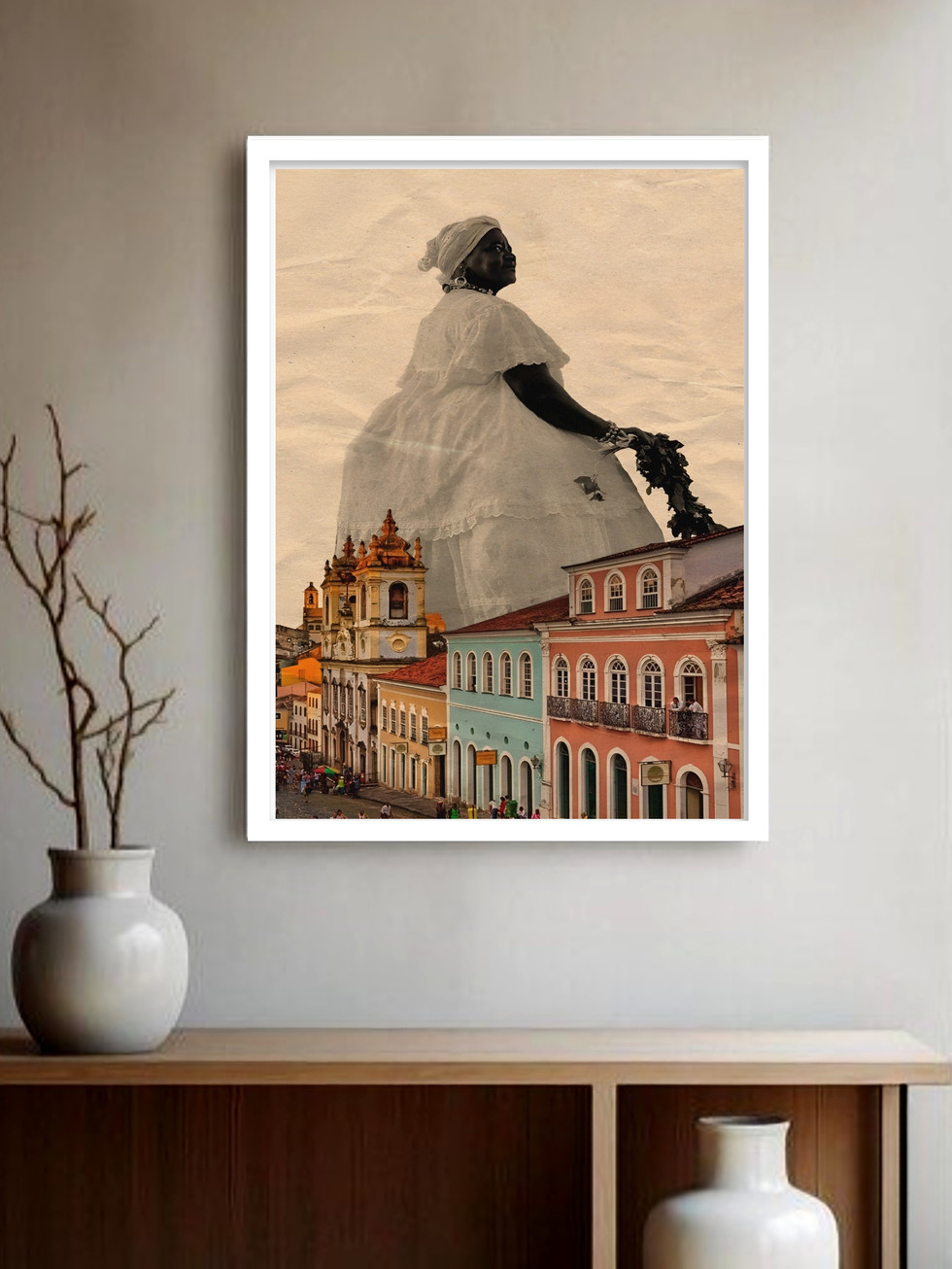 Esta peça é uma poderosa homenagem à cultura baiana. A colagem justapõe a figura imponente da Baiana, símbolo de tradição e fé, com a arquitetura vibrante e colorida do Pelourinho, em Salvador. A escala surrealista confere à figura uma presença monumental sobre o cenário urbano. O contraste entre o sépia da Baiana e as cores fortes das fachadas históricas cria uma obra decorativa rica em história, celebrando a identidade visual e cultural do Nordeste brasileiro.