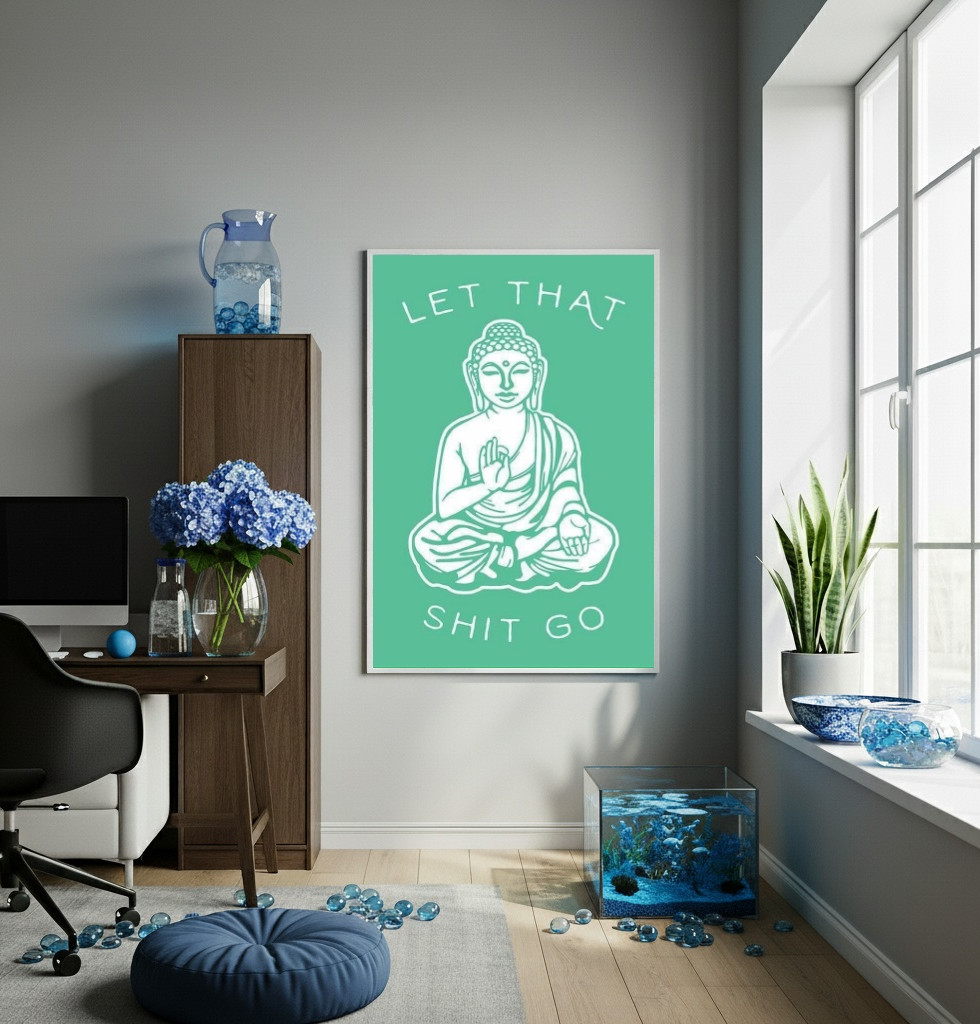 Este quadro decorativo é uma peça de destaque que equilibra perfeitamente a iconografia budista clássica com a linguagem informal e contemporânea. A imagem estilizada de Buda, na pose de meditação, em contraste com a frase "Let That Shit Go", cria um poderoso lembrete visual de desapego e leveza. O fundo verde-água oferece uma sensação de calma, tornando-o ideal para áreas de trabalho ou cantos de relaxamento e meditação. Funciona como um mantra diário, adicionando um toque divertido e irreverente à decoração moderna.