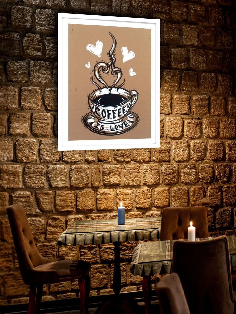 Este quadro decorativo "Coffee Is Love" utiliza uma encantadora gravura em preto e branco sobre fundo kraft. A ilustração da xícara de café, com a fumaça estilizada em corações brancos, é uma celebração visual da paixão pela bebida. A escolha artística confere um toque rústico e artesanal à peça, tornando-a ideal para estabelecimentos de culinária e espaços gourmet. Na ambientação retratada, o poster quebra a frieza do design industrial moderno, adicionando calor e personalidade. Ele transforma a área de assentos em um recanto acolhedor e cheio de estilo, reforçando a mensagem de conforto.