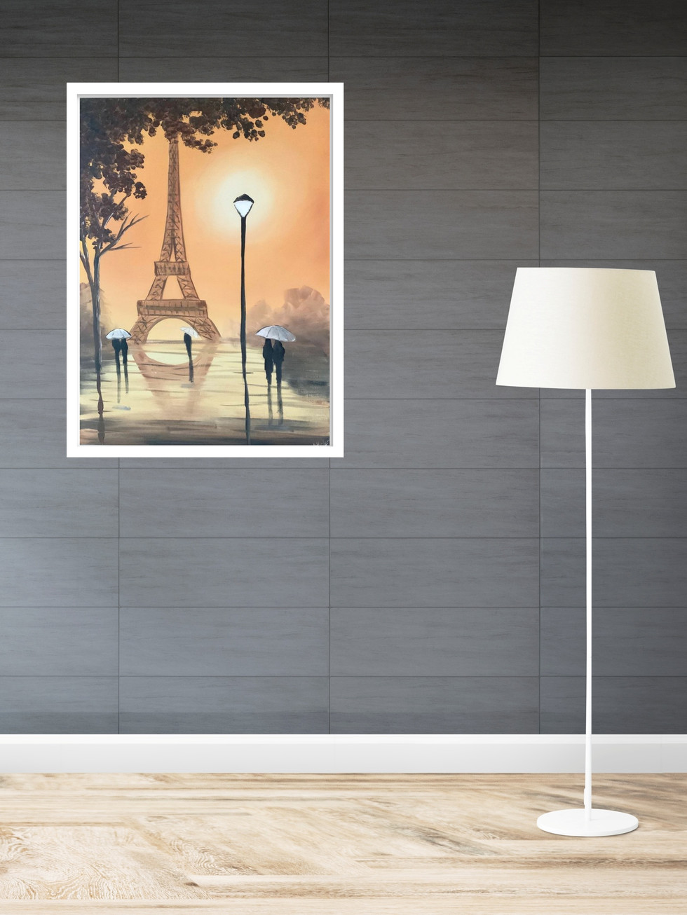 Este quadro decorativo captura a beleza icônica da Torre Eiffel sob um céu alaranjado, sugerindo o crepúsculo ou uma noite chuvosa em Paris. A paleta de cores quentes e as silhuetas com guarda-chuvas criam uma atmosfera profundamente romântica e melancólica. É uma peça perfeita para adicionar um toque de sofisticação e o charme parisiense a qualquer ambiente interno. O estilo expressivo de pintura adiciona uma rica textura visual e profundidade ao espaço.