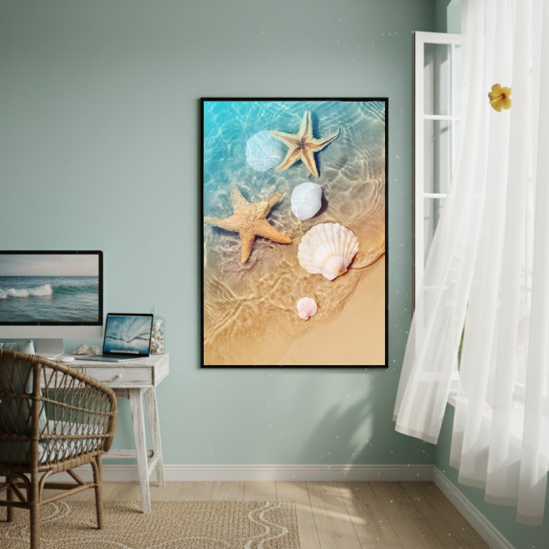 Este painel oferece uma visão refrescante e detalhada do fundo do mar, capturando a serenidade da praia. A estrela-do-mar e as conchas são realçadas pela areia dourada e a água cristalina. A fotografia de alta qualidade cria um efeito de profundidade e movimento, transportando o observador para um ambiente costeiro relaxante. As cores vibrantes de azul turquesa e bege harmonizam-se perfeitamente com decorações leves, sendo uma escolha ideal para trazer tranquilidade e a sensação de férias para qualquer cômodo.