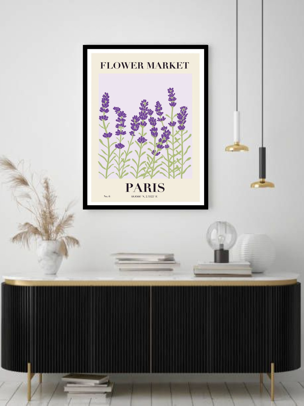 Este quadro decorativo captura a essência romântica e acolhedora de um mercado de flores em Paris. A ilustração minimalista, com hastes de lavanda em tons vibrantes de roxo e verde claro, evoca uma imediata sensação de calma e elegante simplicidade. O contraste nítido entre o fundo lilás suave e as flores estilizadas é visualmente agradável, funcionando perfeitamente contra paredes escuras. A tipografia clássica, que inclui as coordenadas geográficas da cidade, adiciona um toque sofisticado de pôster de viagem vintage. É uma peça ideal para adicionar cor, frescor e um charme botânico marcante a qualquer ambiente doméstico. A composição geral é harmoniosa e transporta o observador para a França.