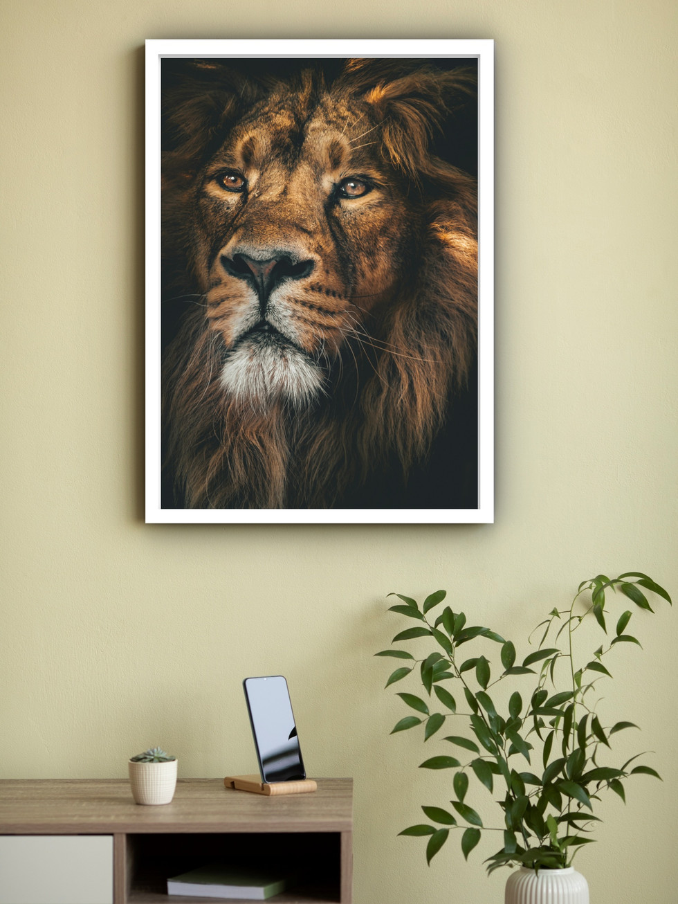 Este quadro decorativo captura a essência da majestade animal com uma fotografia impactante. O close-up detalhado do rosto do leão revela a textura rica da juba e a intensidade hipnotizante dos olhos. O jogo de luz e sombra, com o fundo escuro, confere um ar dramático e sofisticado à peça. É uma escolha excelente para criar um ponto focal de força e elegância em qualquer ambiente. A combinação de tons terrosos com a moldura branca harmoniza bem com a parede em tom suave.