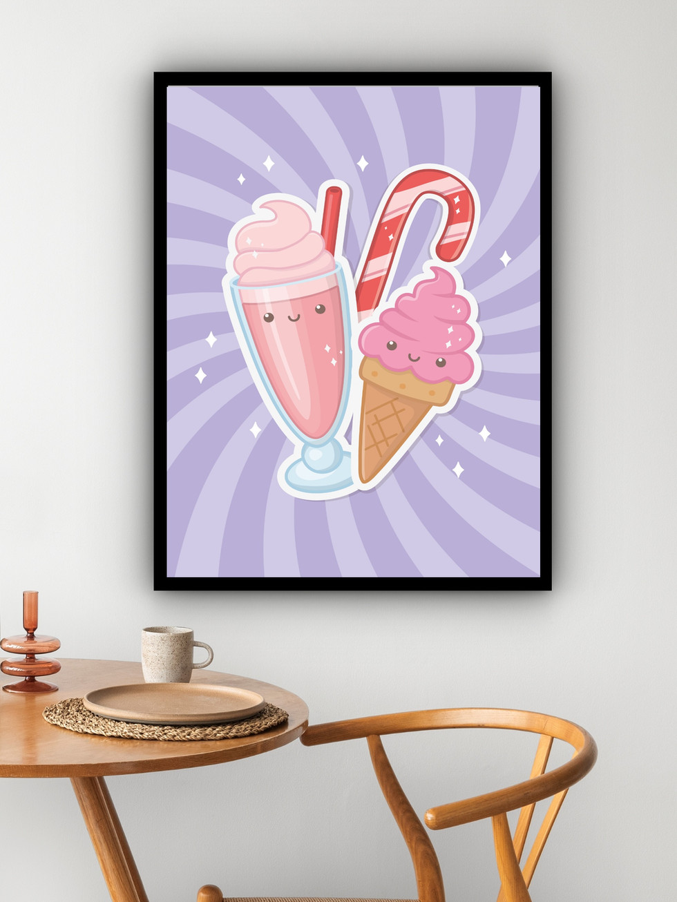 A ilustração apresenta uma dupla deliciosa de sorvete de casquinha e milk shake com faces alegres, ideal para ambientes jovens. O fundo roxo com raios e brilhos intensifica o charme kawaii da cena. As cores suaves e vibrantes em tons de rosa e vermelho oferecem um contraste refrescante contra a parede marrom escura. Este quadro é perfeito para adicionar um elemento lúdico e colorido à decoração do quarto dos pequenos ou de uma área de doces, criando um visual divertido e açucarado.
