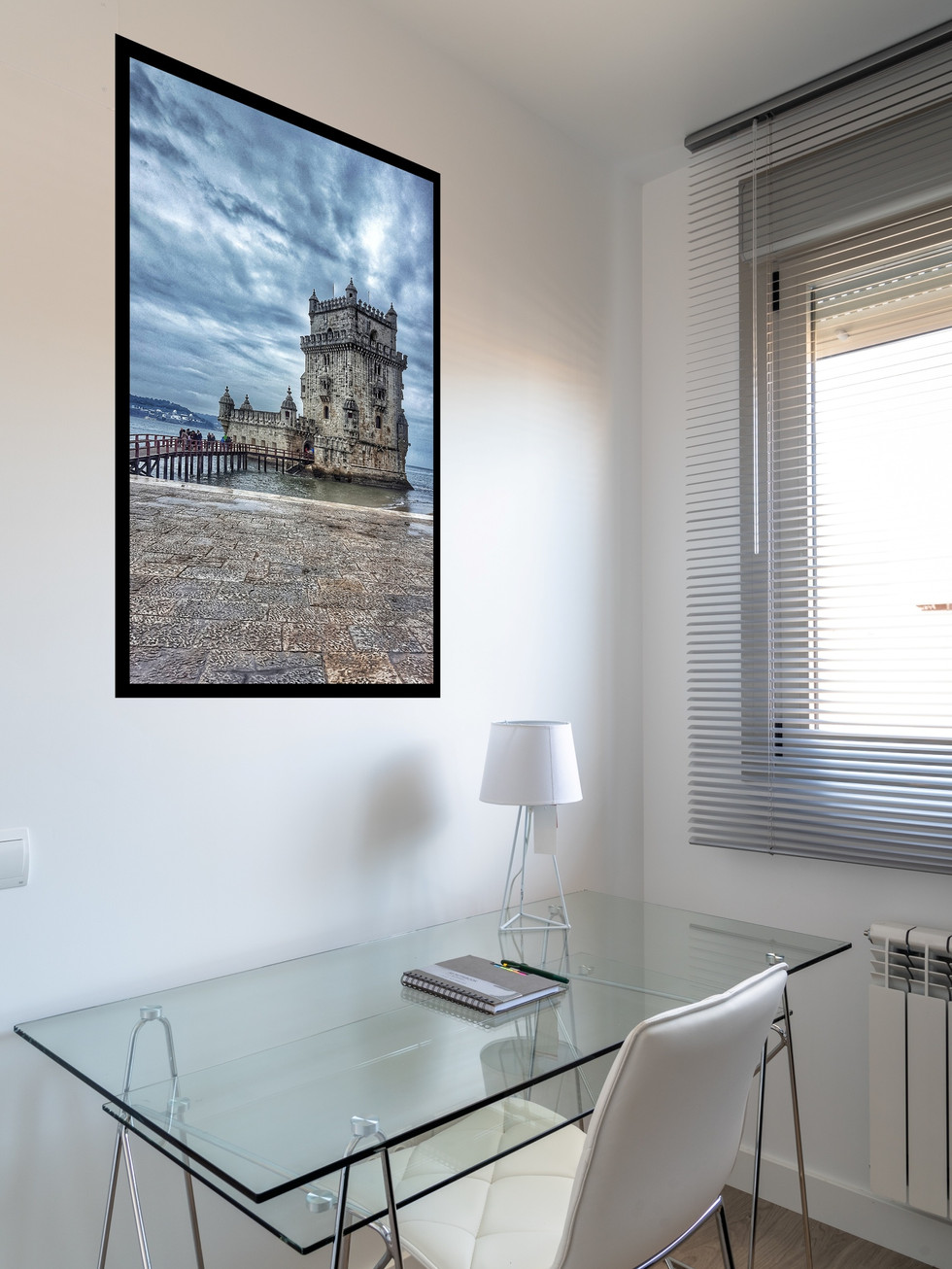 Este quadro capta a imponente Torre de Belém, um símbolo majestoso da história portuguesa, sob um céu dramático e carregado. A composição é forte, utilizando tons cinzentos e azuis profundos que realçam a textura da pedra. A inclusão da calçada portuguesa em primeiro plano confere autenticidade local, enquadrando perfeitamente este destino de viagem. É uma peça decorativa magnífica, evocando a grandiosidade da Era dos Descobrimentos e o fascínio arquitetónico de Lisboa.