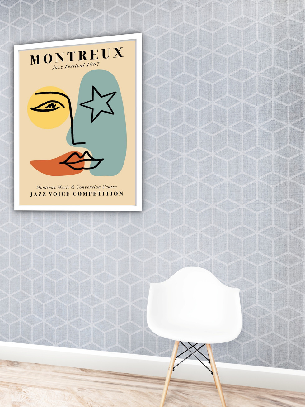 Este quadro decorativo capta perfeitamente a estética modernista e pós-impressionista com seu estilo de recorte vibrante. As formas geométricas simples e o uso audacioso de cores primárias e terrosas (amarelo, azul e laranja) criam uma imagem visualmente marcante. A referência ao Festival de Jazz de Montreux adiciona um toque cultural vintage. É uma peça gráfica ideal para conferir personalidade e um ar sofisticado ao ambiente.