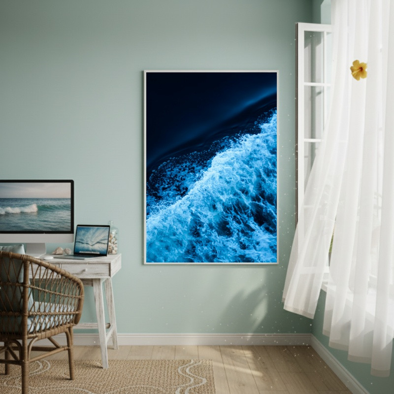 Este quadro exibe uma captura dramática e envolvente das ondas do mar à noite. O azul profundo, quase negro, contrasta intensamente com a espuma branca e vibrante da crista da onda, conferindo à peça uma atmosfera de mistério e serenidade. A perspectiva aérea e o detalhe da textura tornam a imagem hipnotizante. Este contraste poderoso transforma o quadro numa declaração visual forte e elegante, ideal para ambientes modernos. É uma excelente escolha para quem busca um toque de natureza intensa e relaxante na decoração, adicionando profundidade e uma sensação de movimento constante a qualquer espaço.