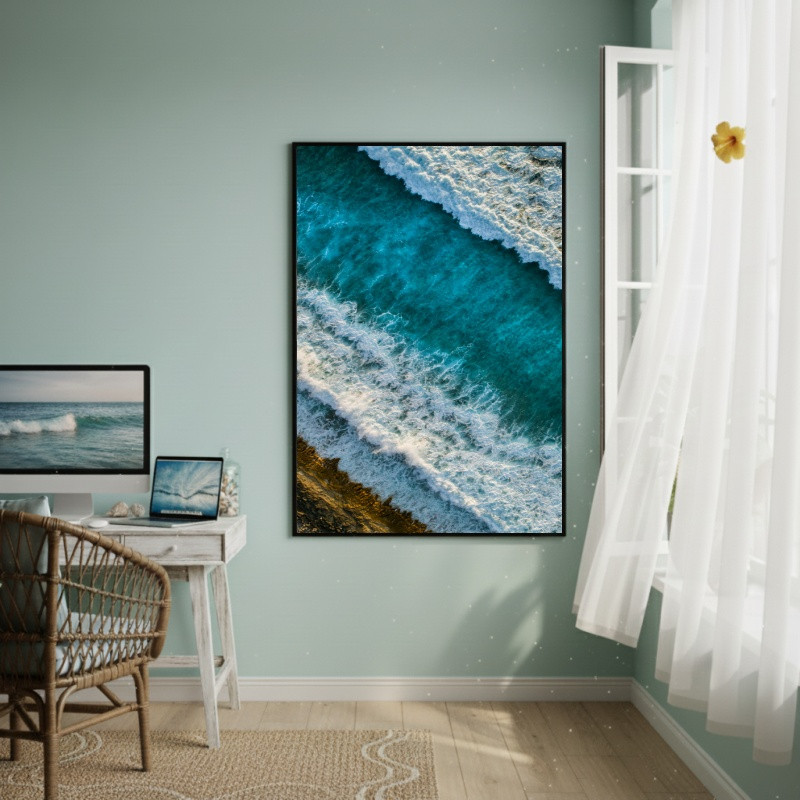 Este quadro decorativo oferece uma perspectiva aérea espetacular, capturando a força e a beleza hipnotizante das ondas do oceano. O uso do azul-turquesa profundo em contraste com o branco vibrante da espuma é visualmente impactante, adicionando profundidade e movimento à parede. A imagem evoca instantaneamente uma sensação de tranquilidade e escape, transformando completamente o ambiente. É a escolha perfeita para quem deseja trazer a energia calma e grandiosa da natureza para dentro de casa. As cores ricas e a qualidade da impressão revitalizam qualquer escritório ou sala, proporcionando um ponto focal relaxante e sofisticado.
