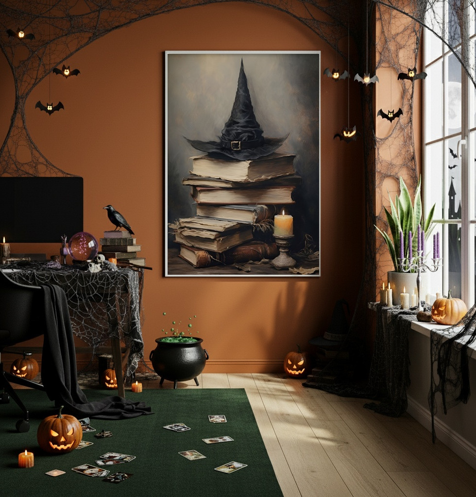 Este quadro decorativo define o tom perfeito para um ambiente místico e teatral. O foco na pilha de livros de magia e o chapéu icônico de bruxa criam uma sensação imediata de história e conhecimento oculto. A luz tremeluzente da vela realça as texturas das capas envelhecidas e adiciona um drama sombrio essencial. É uma peça central atmosférica, ideal para celebrar o espírito do Halloween ou do universo da fantasia gótica, complementando a decoração da sala de maneira impressionante e detalhada. A composição é forte e envolvente.