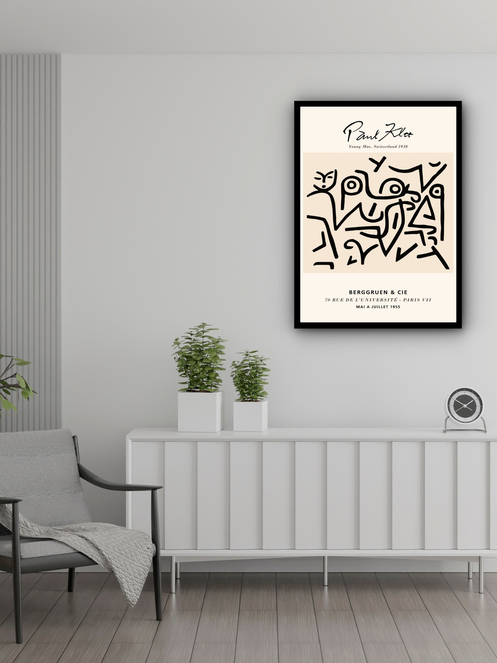 Este quadro de Paul Klee, "Young Moe," é um excelente exemplo de sua abstração figurativa. As linhas pretas, que parecem grafites primitivos, criam uma composição dinâmica e envolvente. O fundo neutro destaca a caligrafia ousada do artista. A peça se integra perfeitamente ao ambiente moderno, criando um contraste sofisticado com o papel de parede geométrico e a poltrona minimalista. Adiciona profundidade e um toque artístico sofisticado ao design de interiores.