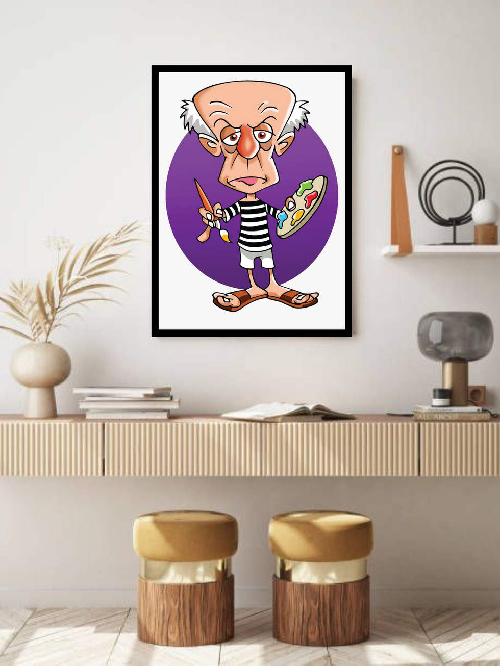 Este quadro decorativo apresenta uma divertida e colorida caricatura de Pablo Picasso, capturando o gênio da arte em um estilo cartoon bastante expressivo. O artista é retratado em sua vestimenta clássica, segurando o pincel e a paleta, com uma expressão séria mas intrinsecamente cômica. O fundo roxo vibrante cria um contraste pop que destaca a figura central. Esta peça é ideal para injetar humor, cor e personalidade em escritórios, ateliês ou salas de estar, agradando a todos os admiradores dos grandes ícones culturais.