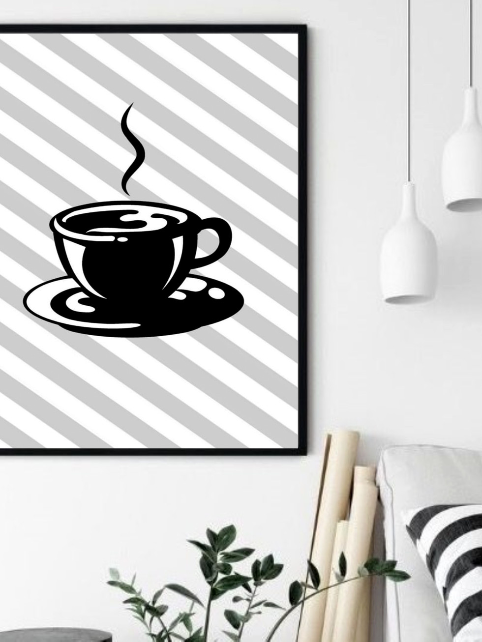 Este quadro decorativo oferece um visual sofisticado e minimalista, centrado na silhueta icônica de uma xícara de café fumegante. O contraste marcante do preto e branco, combinado com as listras diagonais cinzas no fundo, cria um efeito gráfico atraente. É uma escolha perfeita para adicionar um toque de elegância moderna a cozinhas, copas ou áreas de convivência. A temática de culinária é universalmente acolhedora, ideal para quem aprecia o ritual diário de um bom café. O design é contemporâneo e versátil.