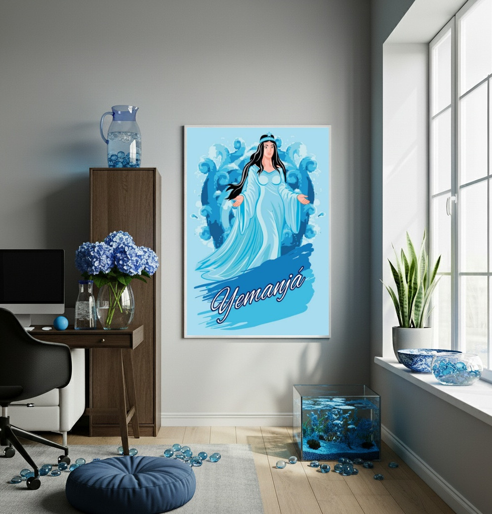 O Quadro Decorativo Yemanjá é uma peça central que infunde serenidade ao espaço. A ilustração vibrante da orixá, cercada por ondas estilizadas, utiliza uma paleta de azuis que remete à profundidade e ao poder do oceano. O tema, carregado de significado cultural e espiritual, confere personalidade única ao ambiente. A escolha de cores harmoniza perfeitamente com os elementos decorativos circundantes, como as flores e o aquário, criando uma atmosfera coesa e tranquila. É um tributo visualmente impactante à Rainha do Mar.