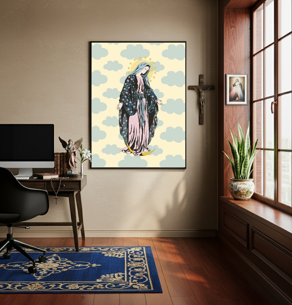 Este quadro oferece uma reinterpretação pop da iconografia de Nossa Senhora, utilizando um fundo amarelo vibrante pontuado por nuvens estilizadas em tons pastel. A Virgem é retratada com vestes escuras e estampadas, um contraste ousado com o tradicional. O uso de linhas fortes e a auréola de estrelas douradas criam uma peça visualmente marcante que equilibra devoção e modernidade. É uma fusão criativa entre o sagrado e o design contemporâneo.