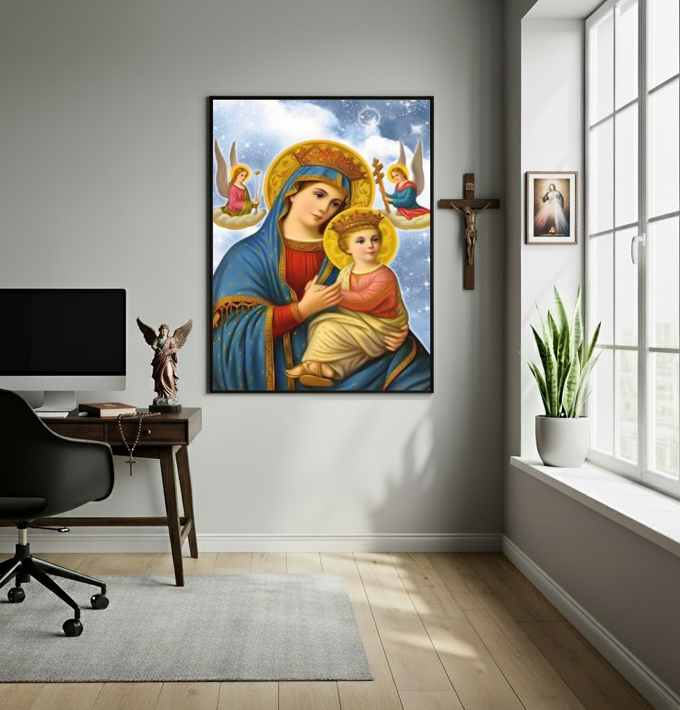 O quadro de Nossa Senhora do Perpétuo Socorro domina o ambiente, apresentando as figuras centrais de Maria e do Menino Jesus. A iconografia é rica, com cores vibrantes e detalhes dourados, contrastando com o fundo cósmico e estrelado. A presença dos anjos com os instrumentos da Paixão intensifica o significado espiritual da obra. Posicionado acima da área de trabalho, o ícone sugere a integração da fé e da devoção pessoal ao cotidiano. A luz natural realça a profundidade e a serenidade emanadas pela figura de Maria, criando um ponto de contemplação visual e espiritual.