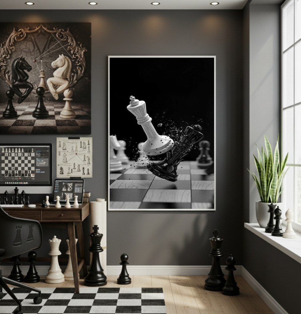 Este quadro captura a essência dramática do xadrez com um dinamismo impressionante. A rainha branca ataca violentamente o rei preto, transformando a peça em fragmentos numa explosão de poder e destruição. A estética em alto contraste preto e branco é elegante e atemporal, destacando a força implacável do xeque-mate. A composição visual intensa é uma poderosa metáfora sobre a estratégia, a vitória e a queda do poder. Esta arte sofisticada e moderna adiciona um toque de intensidade estratégica e profundidade conceitual a qualquer ambiente de trabalho ou lazer.